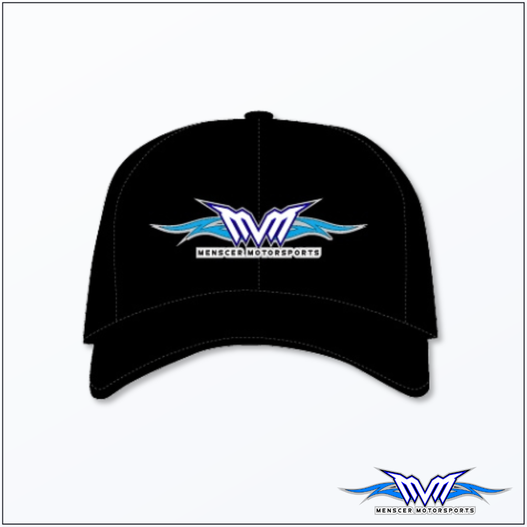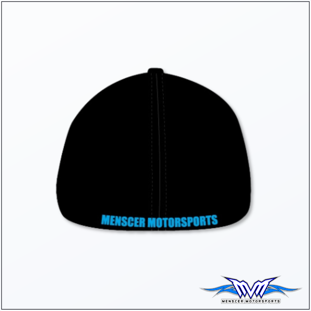 This black Menscer Motorsports hat features the logo on front and "Menscer Motorsports" on the black in distinctive blue trim.