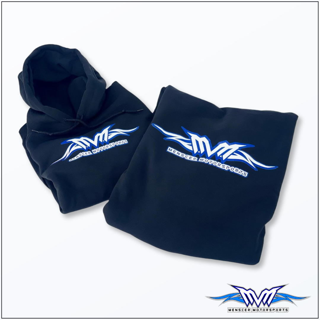 Stay warm with our thick hooded sweatshirt. Sweatshirt is black with the Menscer Motorsports logo on the front and everybody's favorite Shock Nerd on the back.